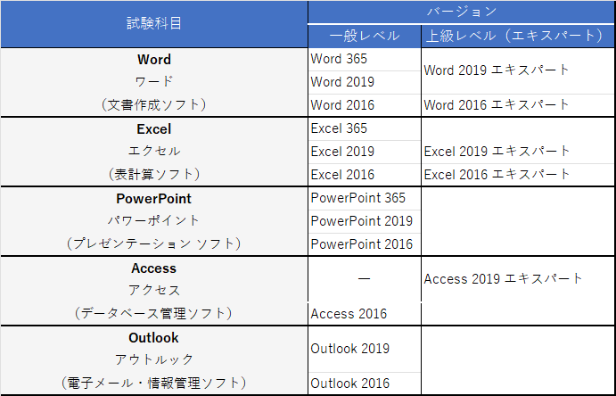 Microsoft Officeは、下図の様々な製品とバージョンがありますので、ご自身が普段、自宅や職場で使っているバージョンや資格取得したい製品を選んで受験ください。